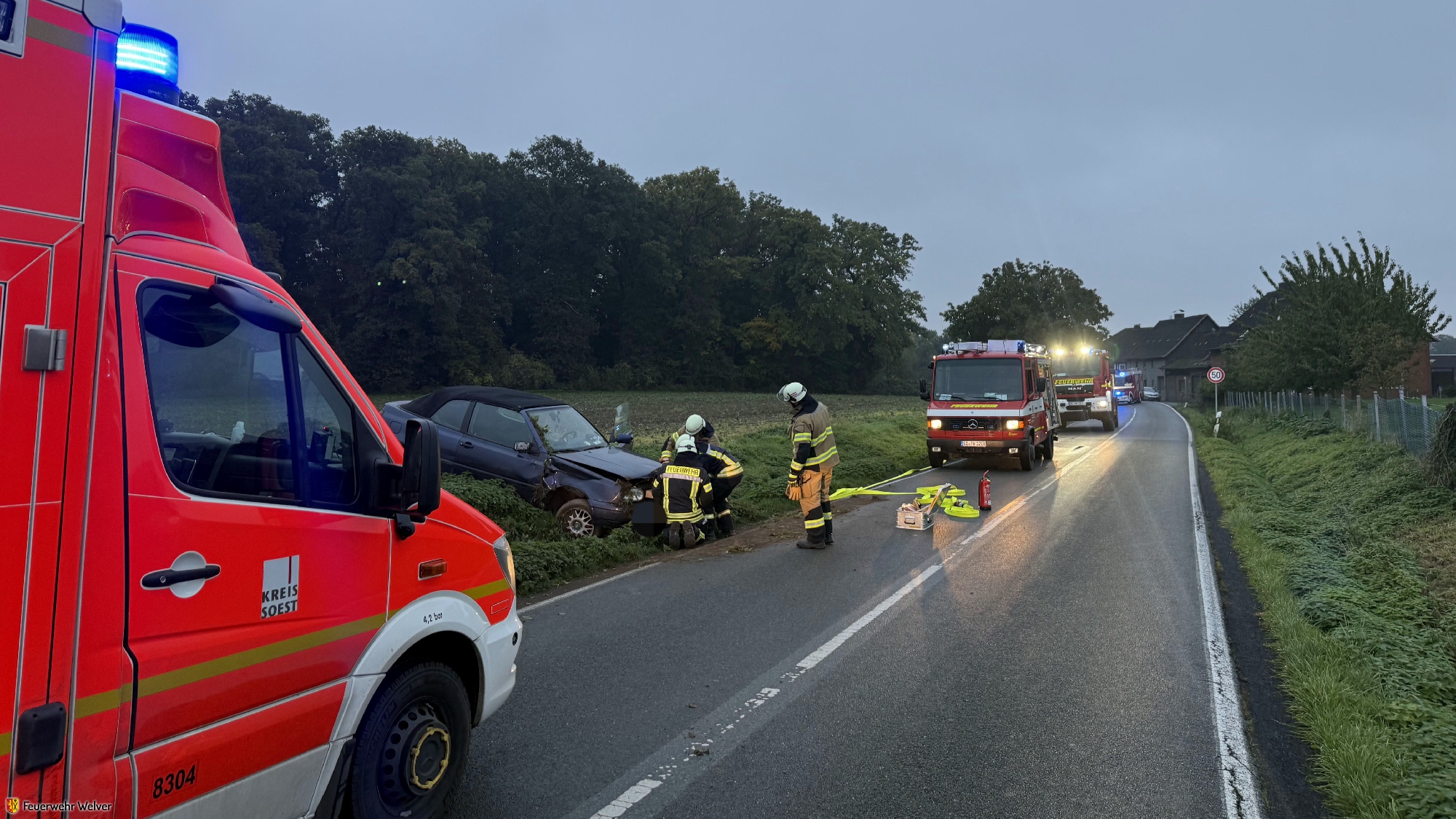 | Einsatzbericht Am Freitag wurde die Feuerwehr Welver zu einem Verkehrsunfall auf der Straße Westen zwischen Recklingsen und Berwicke alarmiert. Im Kurvenbereich kam ein Fahrzeug aus bislang ungeklärter Ursache von der Fahrbahn ab und landete im Graben. Beim Eintreffen der ersten Einsatzkräfte war der Fahrer bereits durch Ersthelfer aus dem Fahrzeug befreit und wurde vom Rettungsdienst versorgt. Die Feuerwehr sicherte die Einsatzstelle ab, stellte den Brandschutz sicher und kontrollierte das Fahrzeug auf auslaufende Betriebsstoffe. Zudem wurde das Batteriemanagement durchgeführt. Anschließend wurde die Unfallstelle an die Polizei zur Unfallaufnahme übergeben. Für die Rettungsmaßnahmen musste die Straße vollgesperrt werden. | |