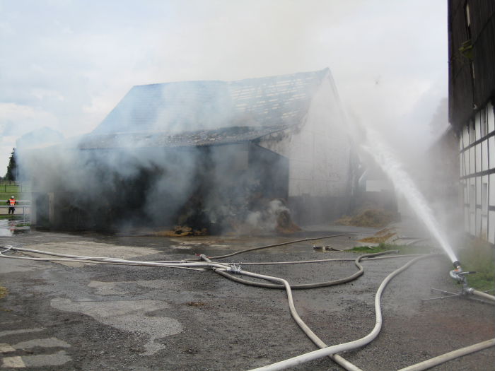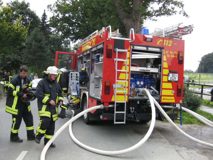 Um 12:52 wurden der 1. und der 3. Zug mit ca. 100 Mann zur Werler Strasse in Welver gerufen. Bei der Reitgemeinschaft Eichengrund brannte ein Pferdestall in voller Ausdehnung. Glücklicherweise waren die 6 untergestellten Pferde schon 2 Stunden zuvor auf eine Weide geführt worden. Die bis unter das Dach mit Stroh und Heu gefüllte Scheune konnte trotz massivem Wassereinsatz nicht gerettet werden. Durch eine Wasserwand von 2. B-Rohren und einem Monitor wurde ein Funkenflug sowie die Wärmeausbreitung zu den nebenstehenden Gebäuden verhindert. In diesen benachbarten Gebäuden lagerten auch große Mengen an Heu und Stroh.