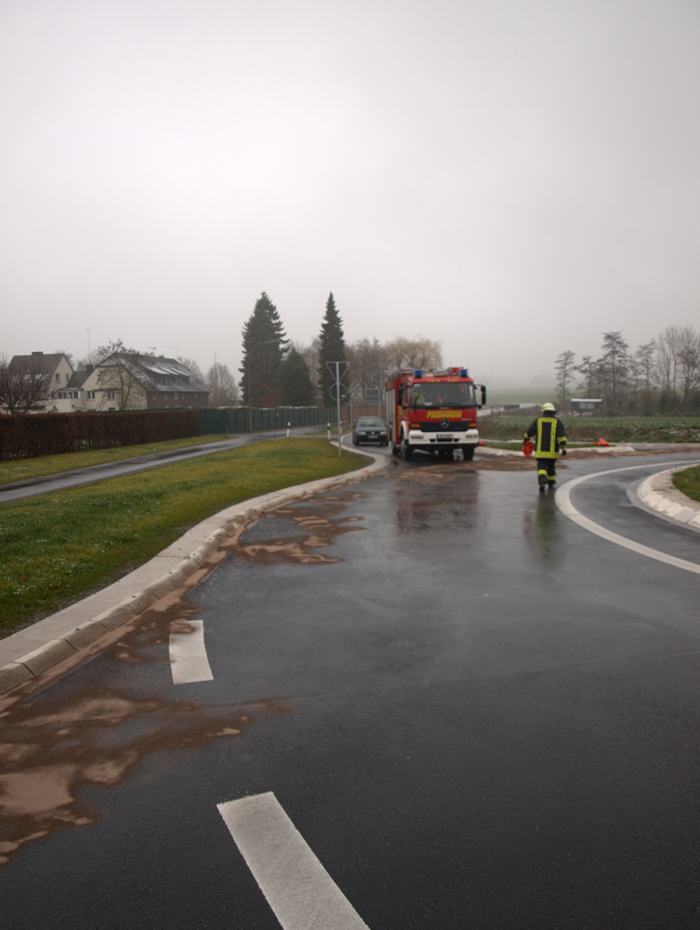 Erneut rief ausgelaufener Kraftstoff die Brandschützer des 1. Löschzuges des Feuerwehr Welver am Dienstag Mittag auf den Plan. Alarmiert um 12:08 Uhr, war das Ziel der Einsatzkräfte aus den Löschgruppen Scheidingen, Welver und Flerke der Scheidinger Kreisverkehr an der L669 Richtung Werl. Ein Anwohner hatte dort eine Kraftstoffspur entdeckt, bedingt durch die Witterung verteilte jene sich großflächig auf der Landstraße sowie der angrenzenden Kreisstraße „Am Zollbaum“.