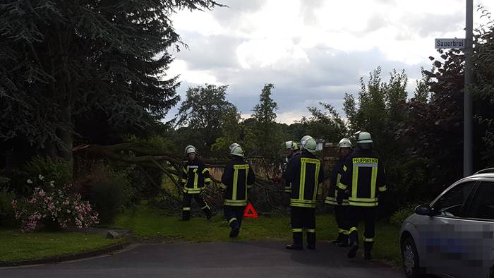 Ein größerer Ast ist aus einem Baum herausgebrochen. Die Feuerwehr beseitigte den Ast mit einer Kettensäge.